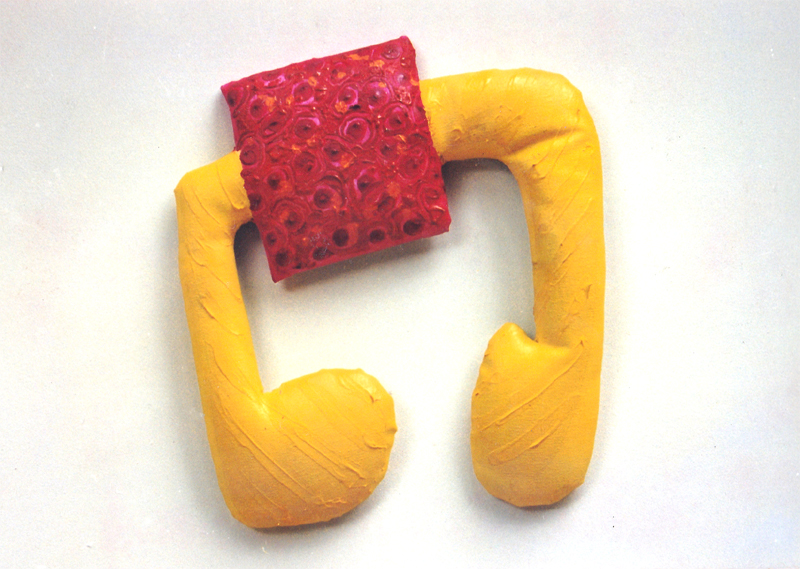 Untitled, 1998. Acrylic on canvas. Cut wood, upholstered with foam. 30cm x 50cm x 10cm